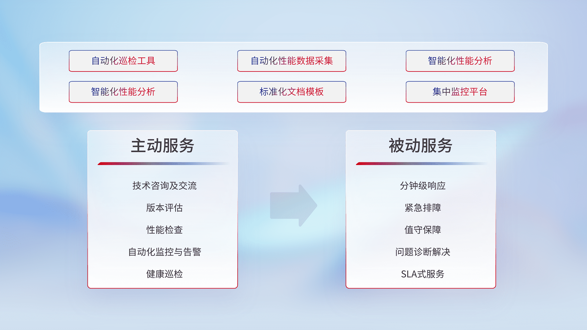 智能化工具和标准化文档,,保障服务质量,,提供主动服务(包含技术咨询、、版本评估、、、性能检查、、、、自动化监控与告警、、健康巡检)和被动服务包含(分钟级响应、、、紧急排障、、值守保障、、问题诊断解决、、、SLA服务)。。